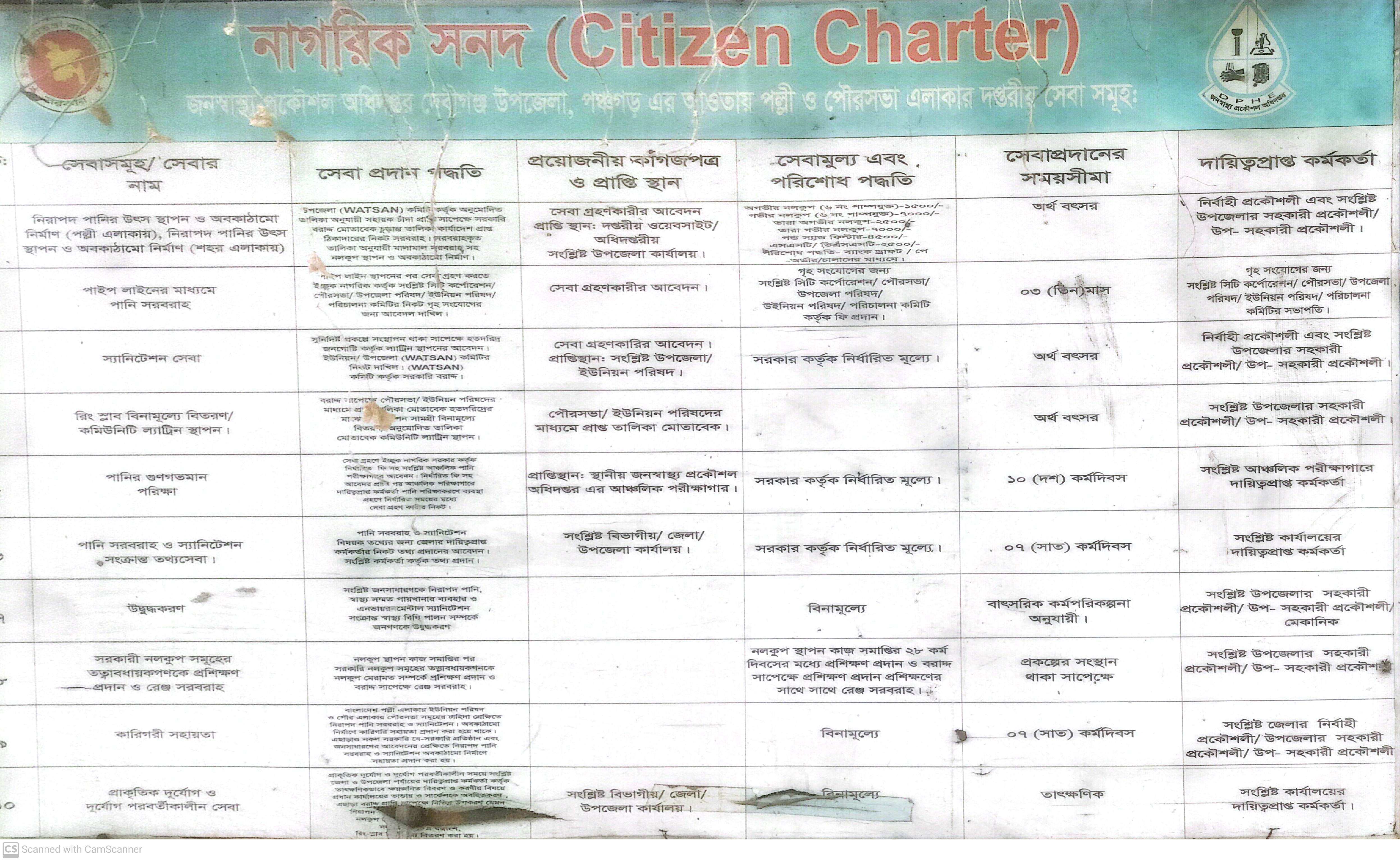 | 1 | বার্ষিক কর্ম সূচীর আওতায় বিভিন্ন ধরনের নিরাপদ পানির উৎসস্ থাপন | 1000/- টাকা থেকে 2000/- টাকা | সকাল 9.00 থেকে বিকাল 5.00 পর্যন্ত | ইউপি চেয়ারম্যান, উপজেলা চেয়ারম্যান ও এমপি মহোদয়ের সুপারিশক্রমে | উপজেলা উপ-সহকারী প্রকৌশলী,নলকুপ মেকানিক |